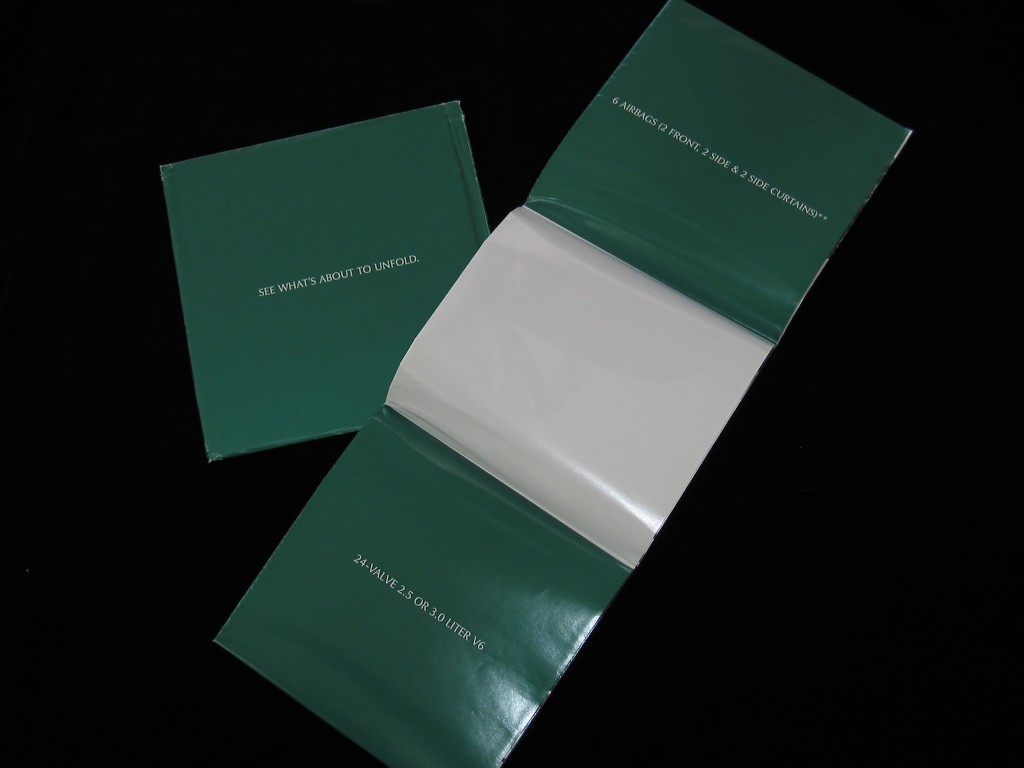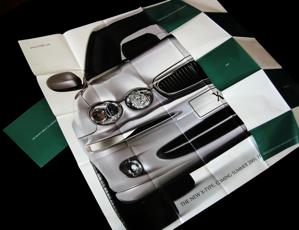 Since the only angle it really looks like a Jaguar is from the front, (sorry Jag) we decided to capitalize on that and mail potential shoppers a full sized folding poster. Just to see how it makes your garage look better. Teaser online ads accompanied.